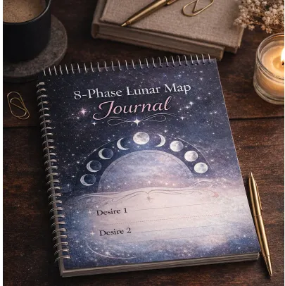 You track your pattern in the 8‑Phase Lunar Map Journal, so you can see what actually moves your desires into reality instead of guessing.