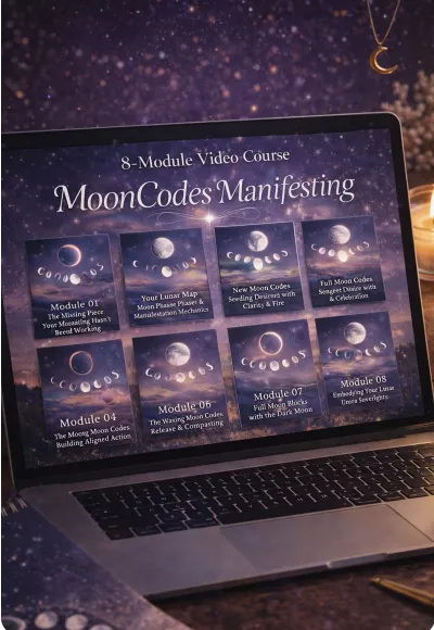 Inside MoonCode Manifesting you get a complete 8 module lunar manifesting course, guided rituals, and over 45+ worksheets and tools that walk you through one full lunar cycle from intention to integration.
